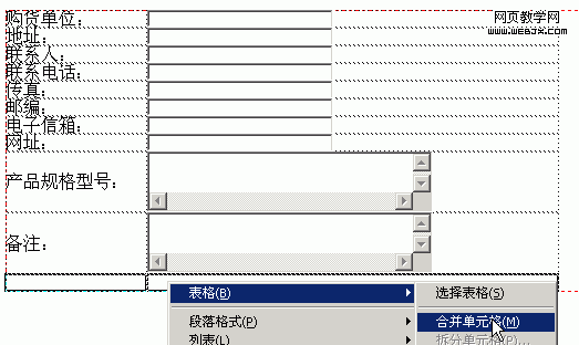 6.重复输入文字和插入“文本字段”,给文本字段命名。按住ctrl键,选中最下面一行的两列,合并单元格。